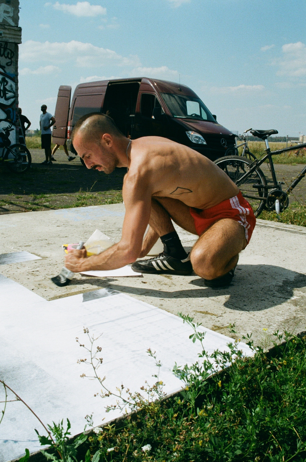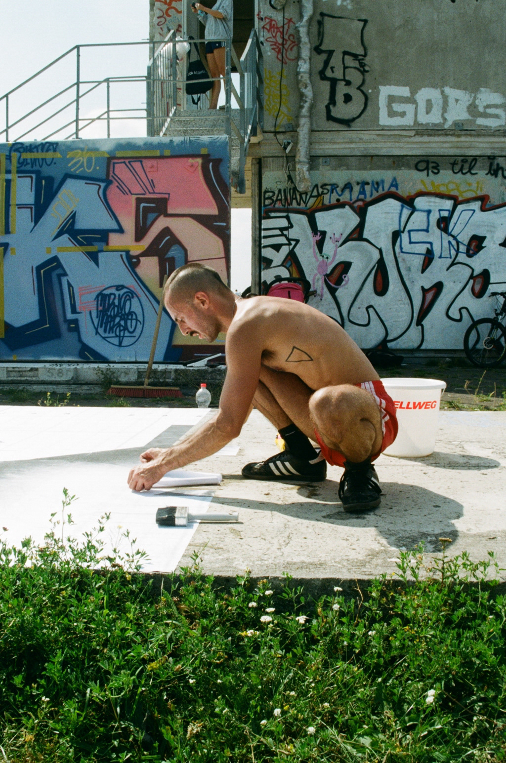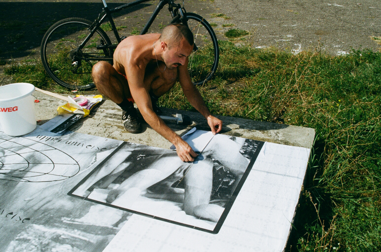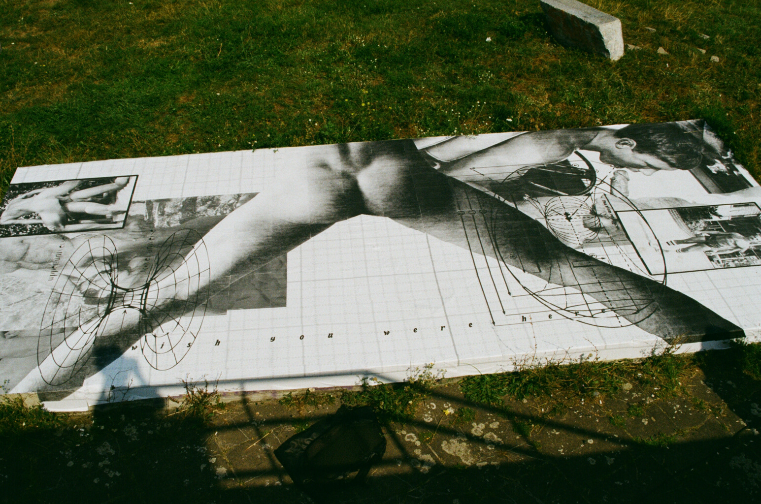 The piece was created for the 3rd installment of Bust A Nut (2019) - the work's title is a meditation on what time travel means in the context of gay history. What would it mean to be able to visit our "Nostalgic Past?" - more importantly, can we essentially do time travel by bringing out desires of the past to now? The piece itself was constructed on a 2,6 x 6,2 meter outdoor concrete slab on the ground and was printed in 314 A4 papers and then tiled together with wallpaper glue. It was removed at the end of the event.